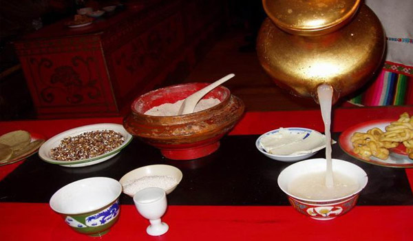 酥油茶藏族的一种饮料。多作为主食与糌粑一起食用。此种饮料用酥油和浓茶加工而成。先将适量酥油放入特制的桶中,佐以食盐,再注入熬煮的浓茶汁,用木柄反复捣拌,使酥油与茶汁溶为一体,呈乳状即成。与藏族毗邻的一些民族,亦有饮用酥油茶的习惯。 酥油茶因具有极高的热量,能消除寒气补充人体...