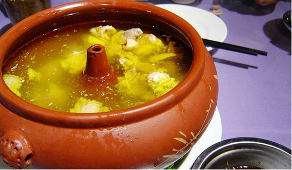 云南具有独特风味的滋补名菜,其做法是先将三七细根用清水浸泡洗净,装入已清洗干净的鸡腹内,将鸡块置于汽锅内,配上佐料,然后放在一只盛有四五公斤水的砂锅上,将两锅接触处密封,用旺火上炖三、四个小时,直到鸡肉蒸熟,以至肉骨分离。这样炖出来的鸡肉原汁原味,肥嫩鲜香,汤汁鲜甜。...