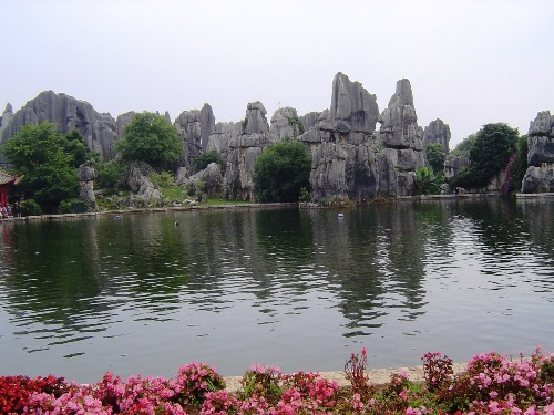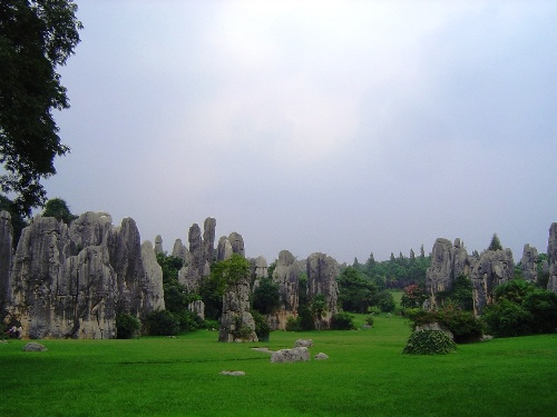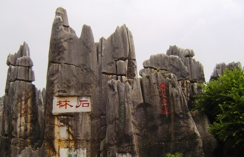穿过石屏后香气袭人的一片桂花林,才见石林的真面目。只见石峰突兀,拔地而起,千嶂叠翠,岩柱形态各异,错落有致,最高的达4 0多米。站在石林前的平地仰望,有许多题词石刻。其中,又大又红的“石林”二字光彩夺目,它是1931年云南省政府主席龙云巡视时所题。自此之后,文人墨客、贤达名士也纷纷题词于胜景之处。如,“天造奇观”、“群岩涌翠”、“大气磅礴”、“拔地擎天”、“此间少得佳趣,何处更寻桃源”……内容言简意深,书法苍劲有力,给石林景观赋予了深刻的文化底蕴。