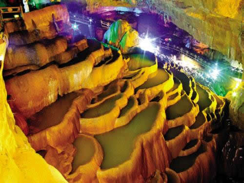 惊魂峡——全国最大的一个洞内峡谷,峡谷最大的落差有上百米。它的形成是由河床不断下切而劈出,当年开辟游路,人攀洞壁而入,稍有不慎,便会掉进深渊,酿成悲剧,工人们要用绳索吊在腰间才能工作,那情境惊险异常,令人魂飞心惧。为了纪念这段开辟的艰险经历,故取名惊魂峡。
