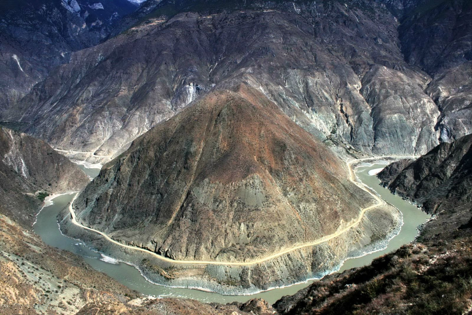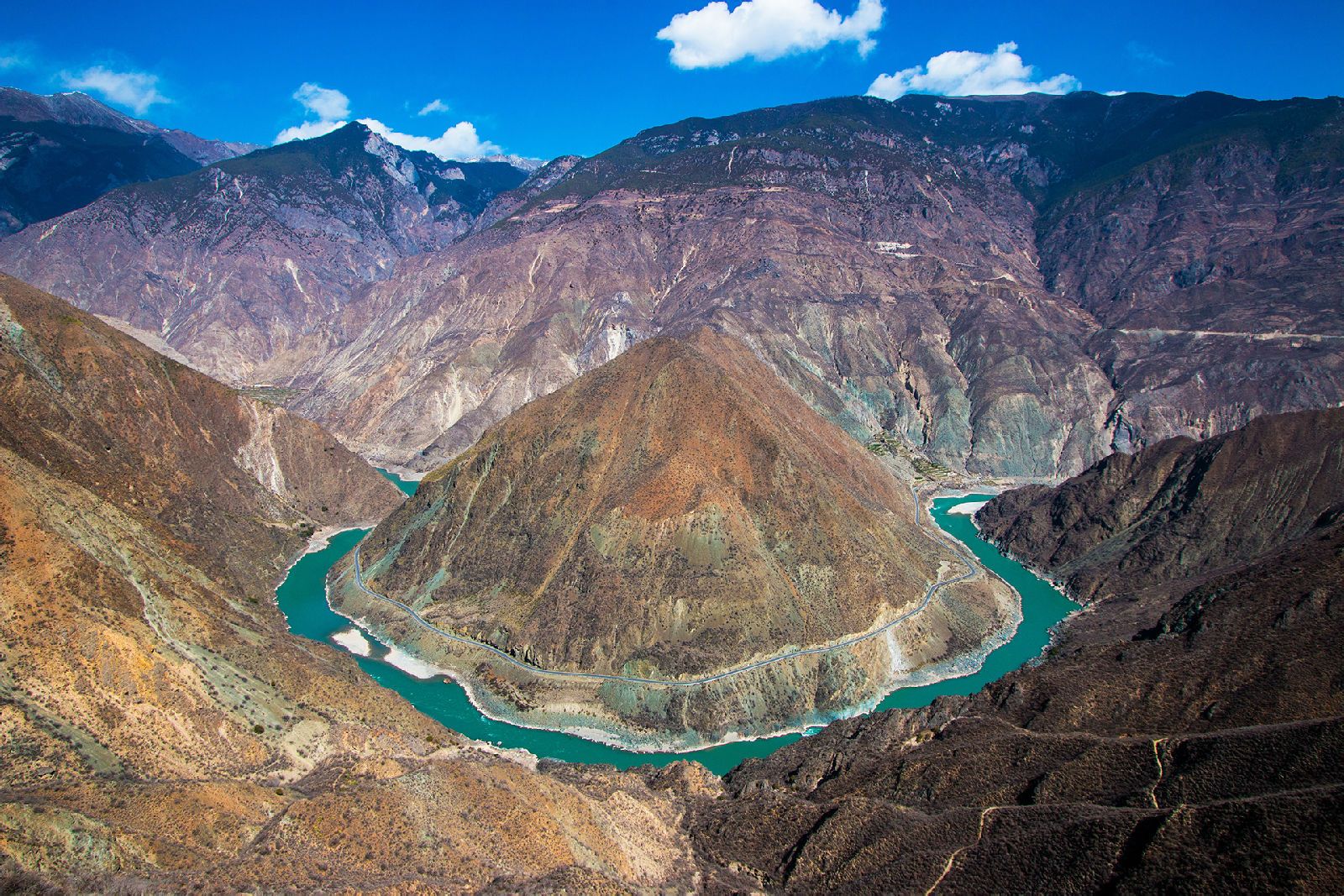 金沙江大拐湾也叫做月亮湾,位于云南德钦县奔子栏镇和四川得荣县子庚乡交界处。由北向南纵贯全境的定曲河,在先后接纳了玛伊河和硕曲河之后,携三江之水投入了金沙江的怀抱,在江水汇合处,形成“三壁夹两江”的奇景。穿山越谷而来的金沙江,由此水势更加浩荡,峡谷逐渐开阔,在即将冲出这川滇要塞之时,它似乎想先舒缓一下长途奔波的疲劳,于是放慢脚步,围绕着金字塔般的日锥峰潇洒地画了一个“Ω”字形的大拐弯。孰料这不经意的即兴之作,竟成就了一处奇观。