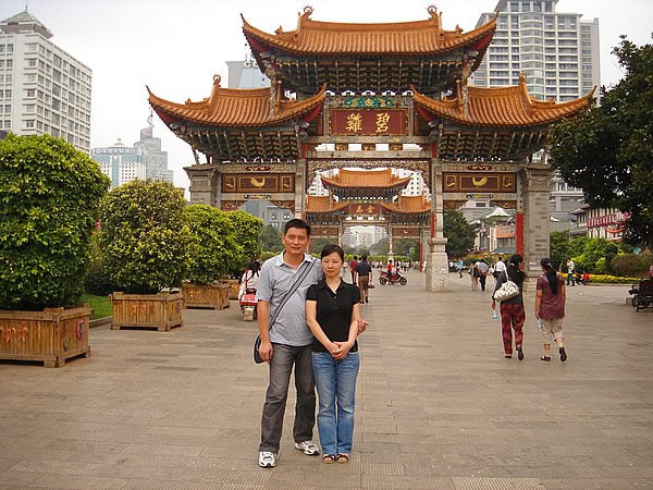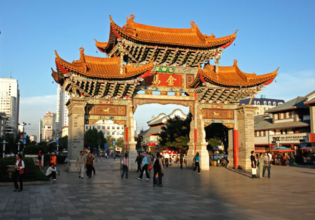 当太阳将落,余辉从西边照射碧鸡坊,它的倒影投到东面街上;同时,月亮则刚从东方升起,银色的光芒照射金马坊,将它的倒影投到西边街面上;两个牌坊的影子,渐移渐近,最后互相交接。这就是60年才会出现一次的"金碧交辉"的奇观。相传,清道光年间,这个奇观曾经出现过一次。由于地球、月亮、太阳运转的角度关系,这样的景,要 60年才能出现一次。"金马碧鸡坊"的设计体现了古代云南人对数学、天文学和建筑学方面的造诣。[1] 原“金马碧鸡坊”于10年动乱中被拆毁,现有的"金马碧鸡坊"是1998年在原址按原风格重建的。