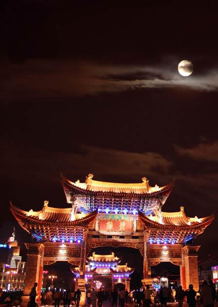 该坊建于明朝宜德年间,到现在已经有400多年的历史了。也因它的历史悠久,民族特色突出,所以被看作是昆明的市徽。那“金碧交辉”,据说是由于地球、月亮、太阳运转的角度关系,两个坊的倒影如约而至,渐移渐近,光影慢慢相交而形成。这也是金马碧鸡坊最让人称妙的地方。在古代能有这样的设计真是件了不起的事。
