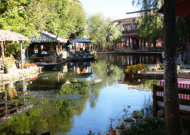 从丽江古城往北,沿中济海东侧的大路行约四公里,便见两边山脚下一片密集的村落,这就是被称为清泉之乡的束河古镇。当年徐霞客游芝山解脱林时,曾走过此道,在他的记述中这样写道:“过一枯涧石桥,西瞻中海,柳暗波萦,有大聚落临其上,是为十和院。”“十和”即今束河古镇之古称。历史开通于唐代的茶马古道,从滇南经丽江直达西藏拉萨,经唐、宋、元、明、清千余年的运营发展,促进了沿线各族人民的经济文化交流,束河即是丽江坝子中保存完好的驿站,1997年被列为“世界文化遗产”丽江古城的重要组成部分。[1]